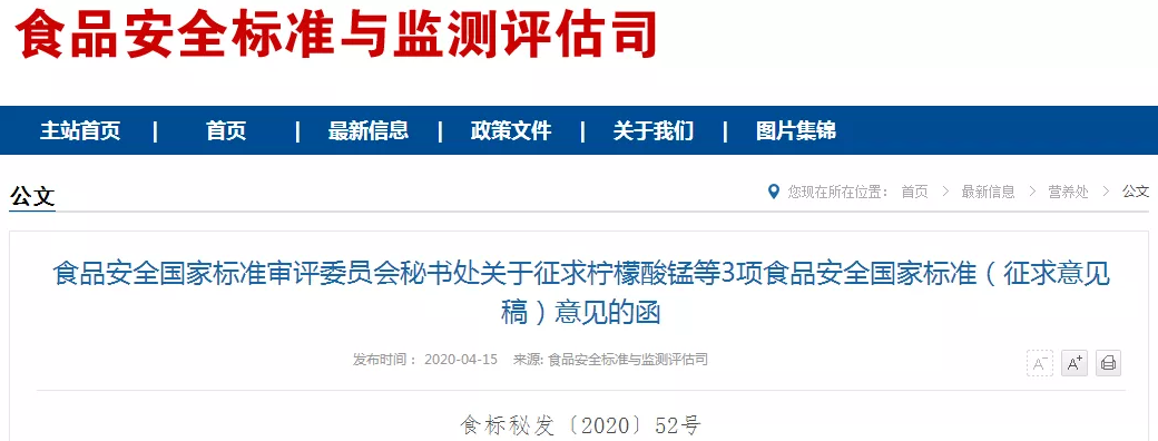 根據(jù)《食品安全法》及其實施條例規(guī)定,我委組織起草了《食品安全國家標準 檸檬酸錳》等3項食品安全國家標準(征求意見稿),現(xiàn)向社會公開征求意見。請于2020年6月6日前登錄食品安全國家標準管理信息系統(tǒng)(